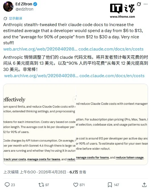 而该页面在 4 月 16 日之前的存档版本显示,此前的估算为每个开发者每个活跃日 6 美元(现汇率约合 41.1 元人民币),且 90% 的用户每日成本低于 12 美元(IT之家注:现汇率约合 82.2 元人民币)。