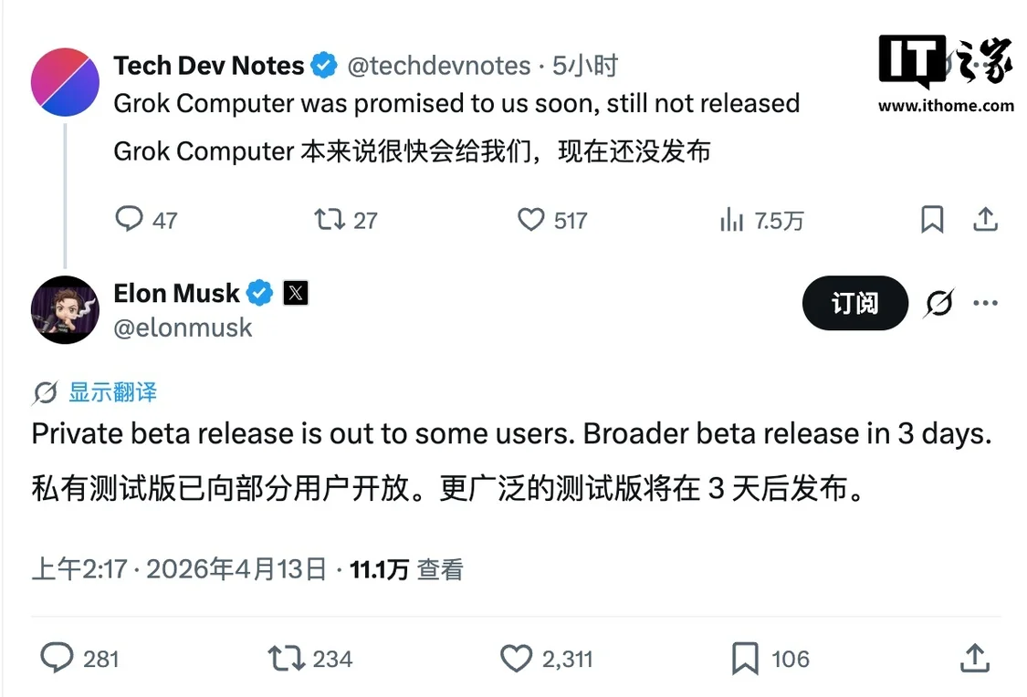 4 月 13 日消息,北京时间今天凌晨,马斯克在 X 平台上恢复用户关于 Grok Computer 智能体何时推出的帖子时表示:私人测试版已向部分用户开放,三天后将发布更广泛的测试版。