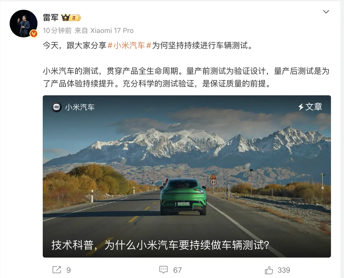 雷军回应小米汽车坚持车辆测试:充分科学的测试验证,是保证质量的前提