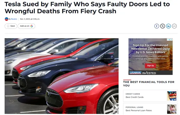 特斯拉遭诉讼:Model S事故后起火 车门无法打开致5人死亡